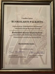 Ruokolahti-Seura sai vuonna 2020 Ruokolahti-palkinnon julkaisemastaan kirjasta Torppareista digiaikaan.